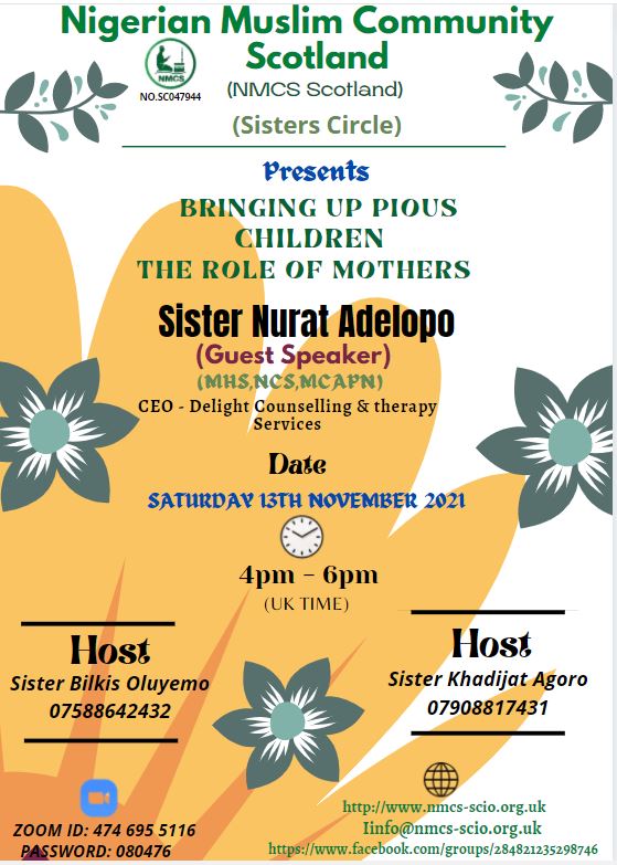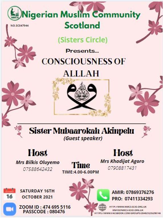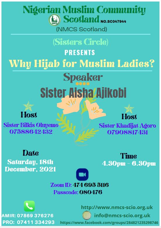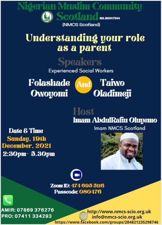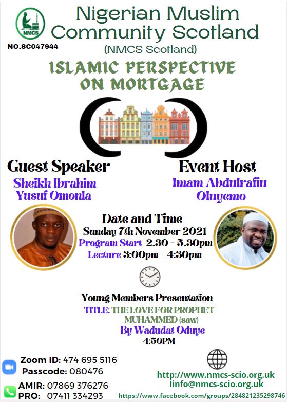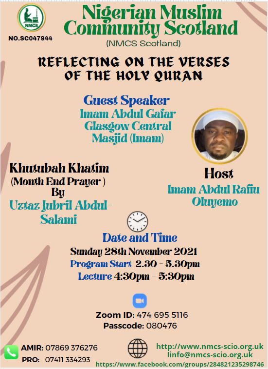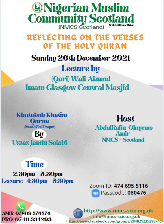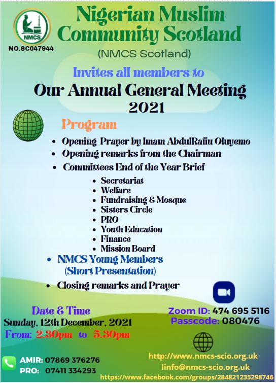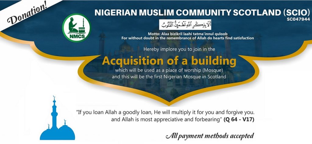 Nigerian Muslim Community Scotland (NMCS) is an Islamic organisation originally started by the Nigerian Muslim Community living in Glasgow in 2007. The organization was created for the purpose of Islamic advancement, spiritual upliftment, religious and racial harmony. We now have members from Edinburgh and Livingston.