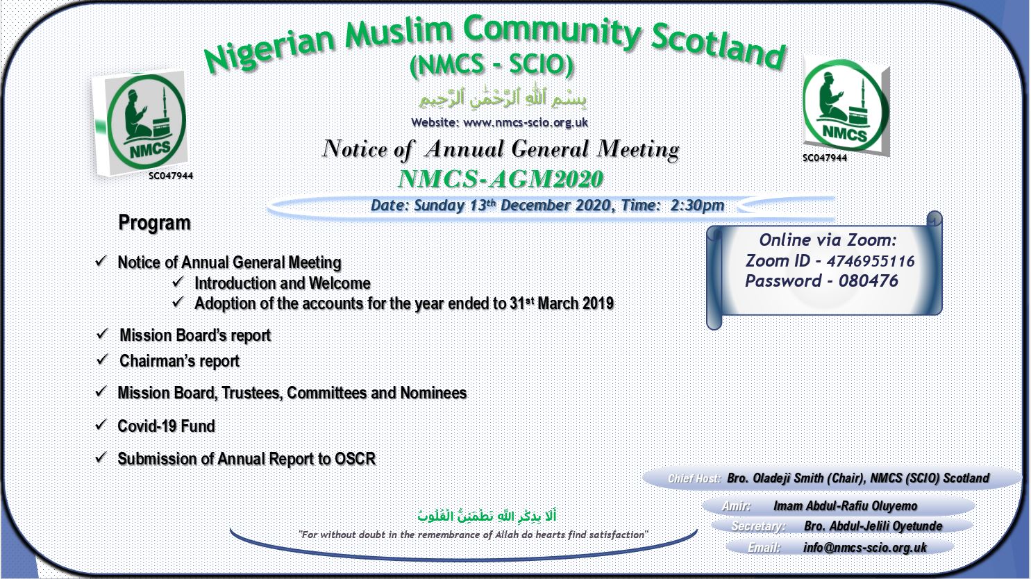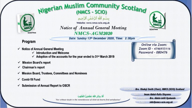 NMCS recognizes that this is an unprecedented time for communities in Scotland due to the COVID-19 pandemic. Our response so far: All meetings now on Zoom platform. We have a COVID-19 relief support for residents of Glasgow (Available for delivery by our volunteers). Kindly contact NMCS to book a delivery. Jazakumullah Khairan. May Allah continue to protect us, Amin.