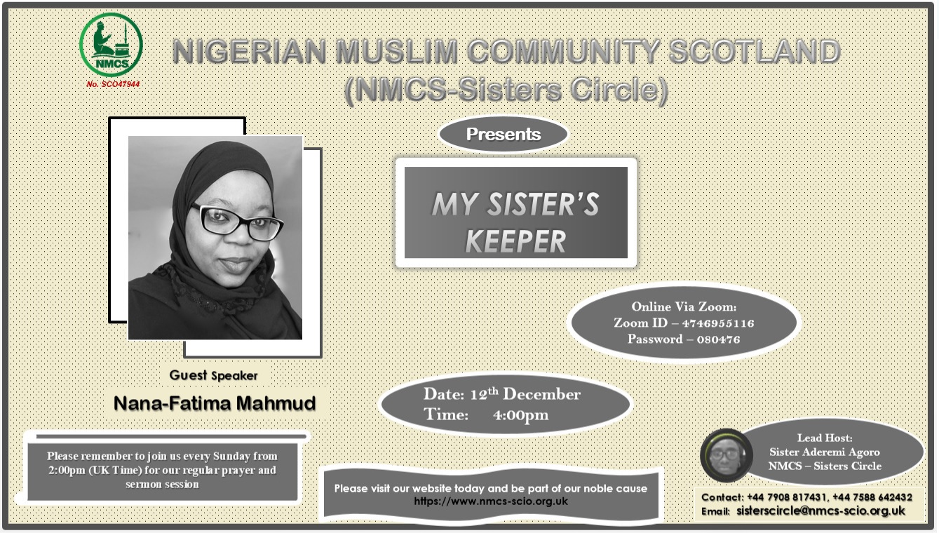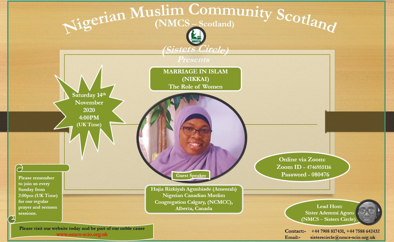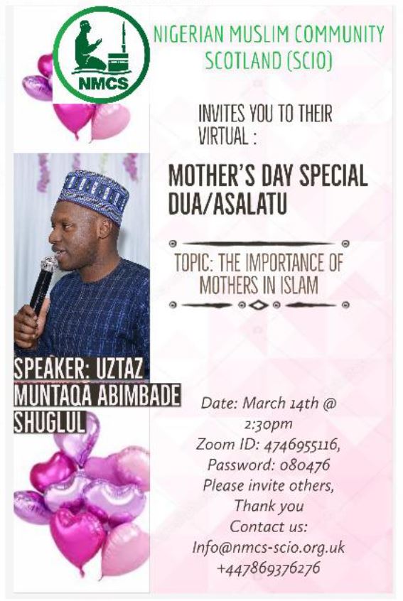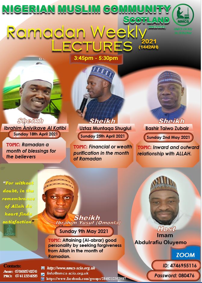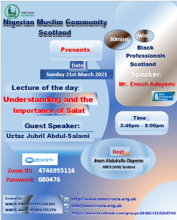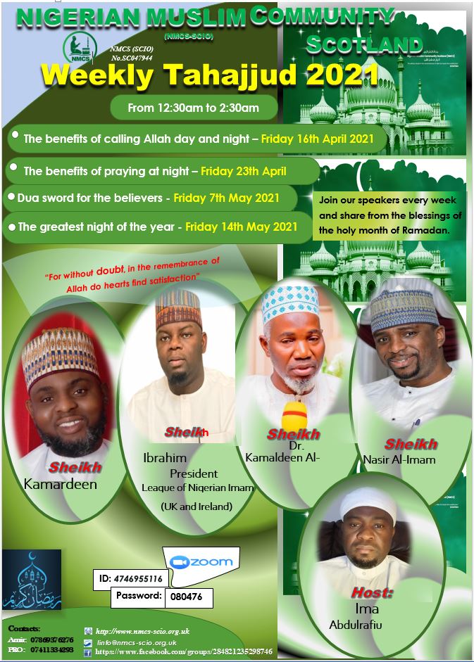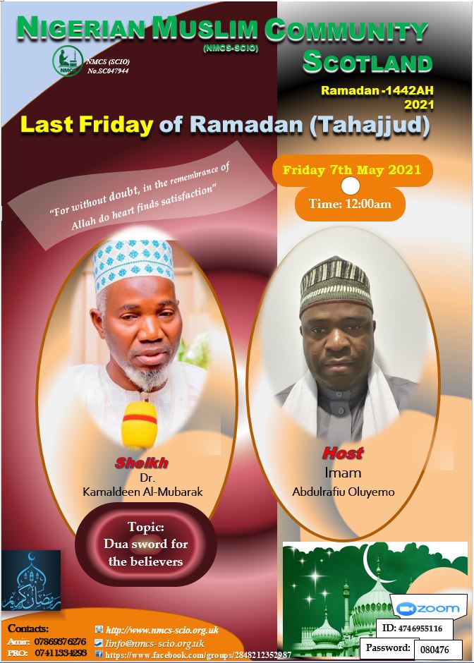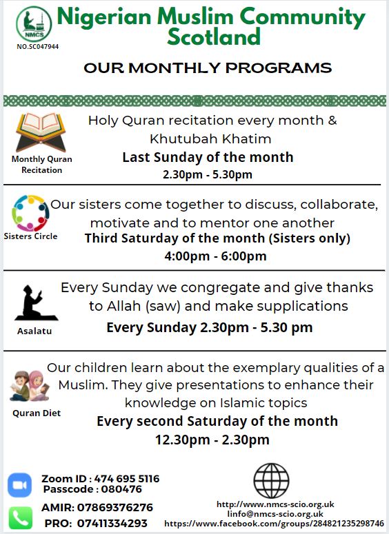Nigerian Muslim Community Scotland (NMCS) is an Islamic organisation originally started by the Nigerian Muslim Community living in Glasgow in 2007. The organization was created for the purpose of Islamic advancement, spiritual upliftment, religious and racial harmony. We now have members from Edinburgh and Livingston.